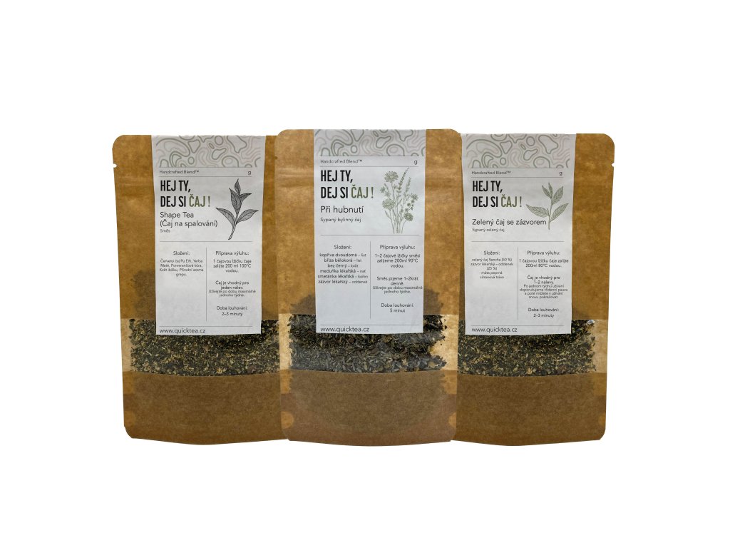 Balíček Do plavek spojuje tři pečlivě vybrané směsi – Hubnutí, Shape tea a Zelený čaj se zázvorem. Dohromady tvoří praktický set pro ty, kteří chtějí podpořit aktivní životní styl a zařadit do dne čajový rituál.