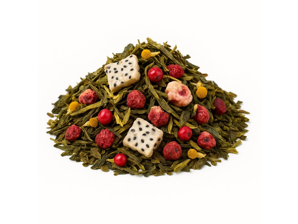 63 % zelený čaj, 8 % oolong, dračí ovoce (kousky), bílý čaj, žlutý čaj, přírodní aroma, růžový pepř (celá jádra), maliny, ostružiny, květy heřmánku, vanilka