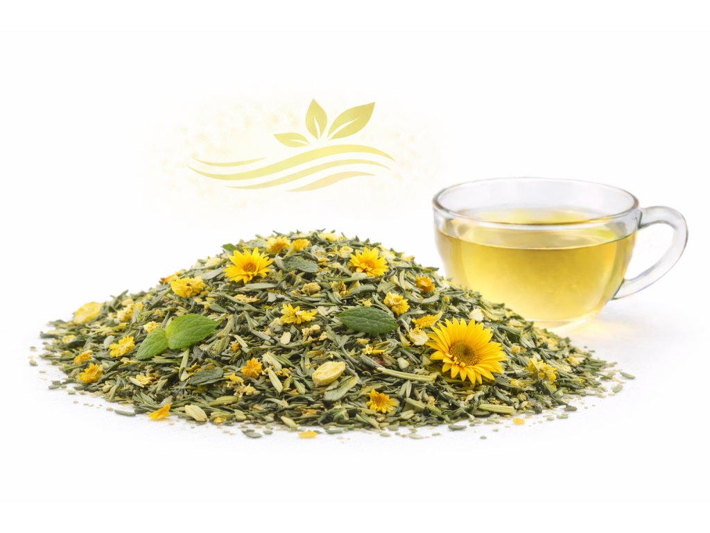 Japonská louka – zelený čaj je jemná, klidná směs postavená na japonské Senche, doplněné o China Gunpowder a květy měsíčku a slunečnice.