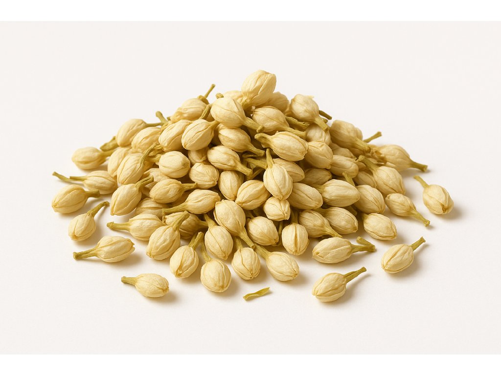 Celá poupata jasmínu pravého s jemnou a výraznou vůní. Skvělá do nálevu, čajových směsí, olejů nebo jako vykuřovadlo.