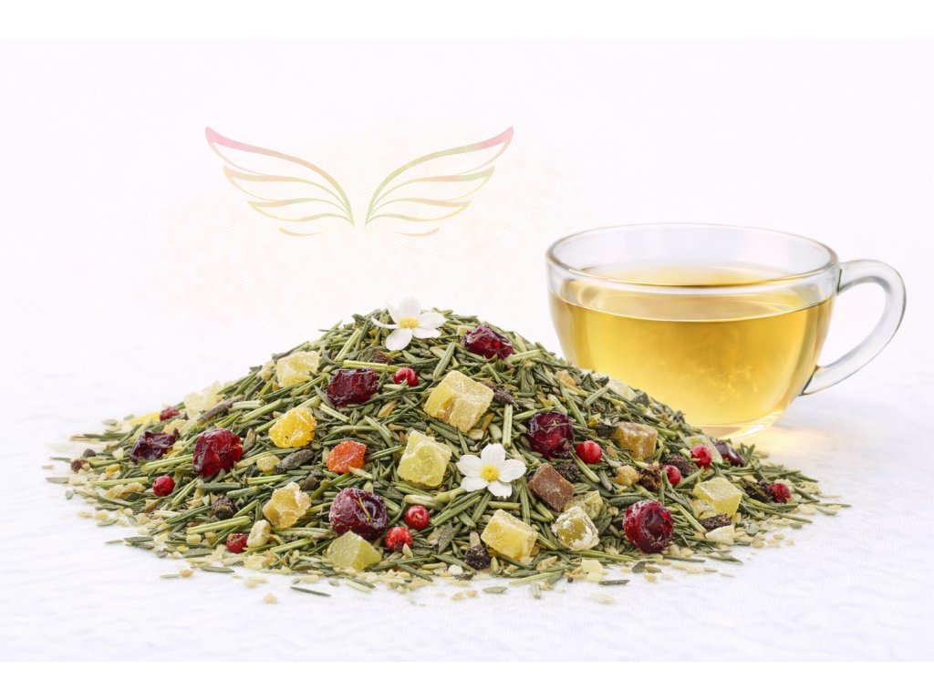 Křídla vůní – zelený čaj je elegantní směs postavená na japonské Senche z oblasti Shizuoka, doplněná o višně, jasmín, ananas a citronovou trávu.