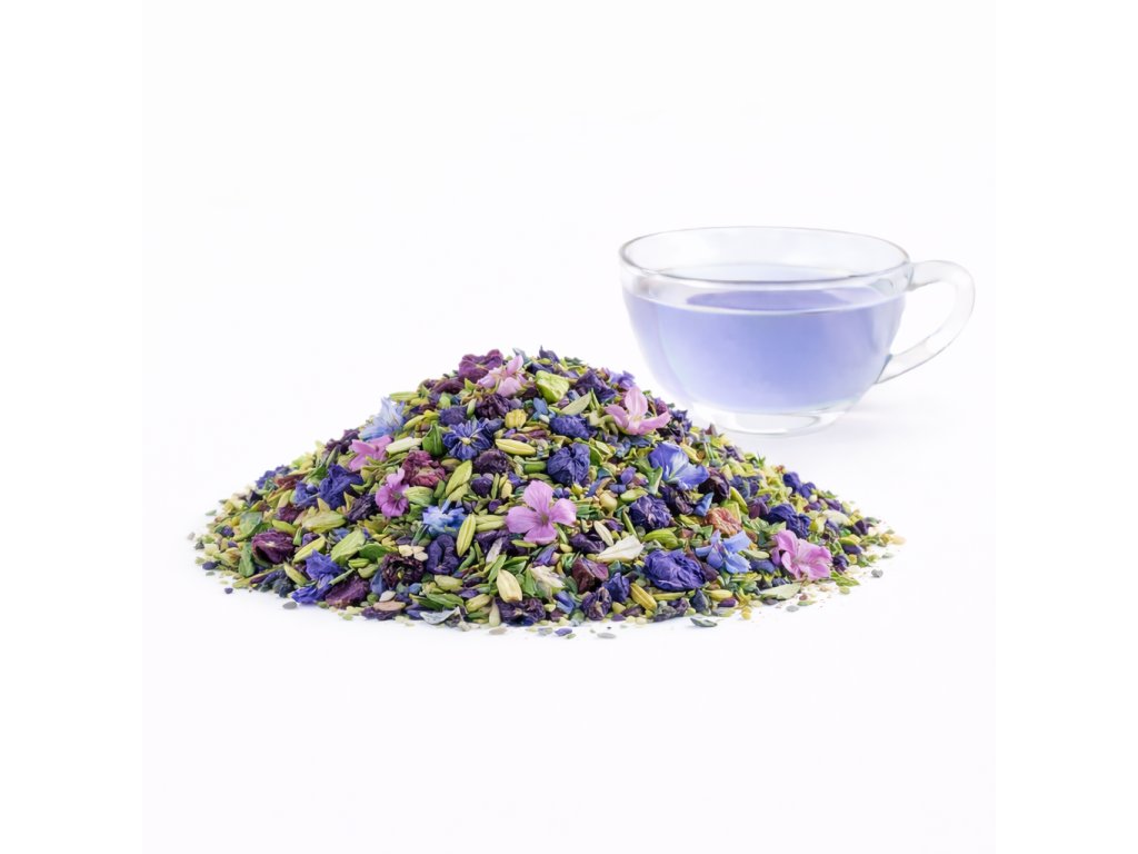 Ledový zázrak je směs, která ozvláštní každý horký den. Díky klitorii a slézu vzniká při cold brew přípravě přirozeně modrý nálev. A to nejlepší? Pokud přidáte citronovou šťávu, nálev se vám promění do růžové až fialové barvy. Je to malý „čajový trik“, který baví a zároveň krásně vypadá.