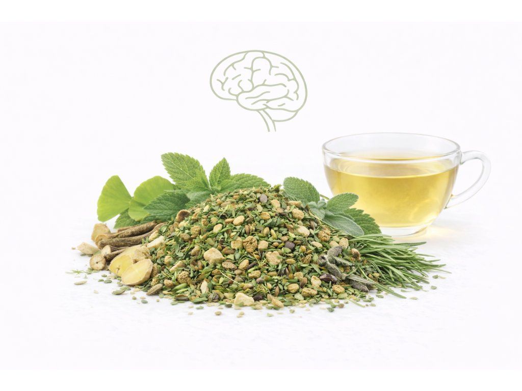 Hlavní roli hraje jinan dvoulaločný (normální činnost mozku a paměť) a rozmarýn lékařský (podpora krevního oběhu a koncentrace). Meduňka lékařská napomáhá relaxaci a udržení klidné hlavy bez útlumu, máta kadeřavá osvěží šálek a šalvěj doplní bylinný profil. Jemně přítomná vithánie snodárná (ashwagandha) směs zakulatí a podpoří duševní rovnováhu.