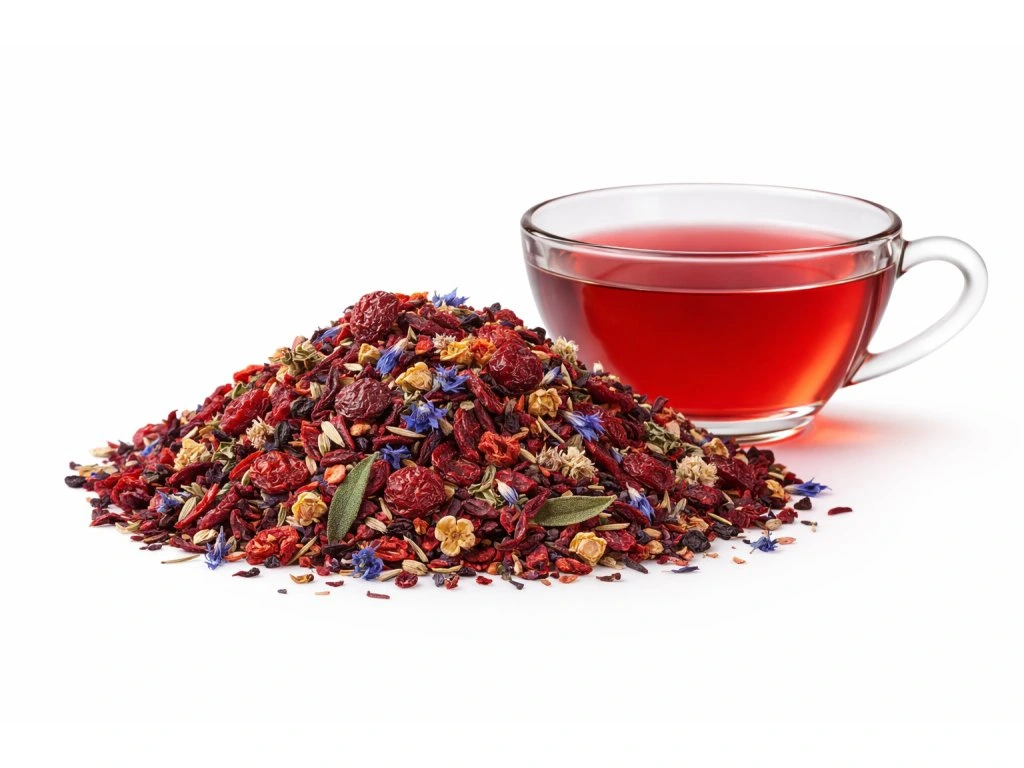 Bylinková část směsi se stará o vyvážení: ibišek dodává sytý tón a příjemnou kyselkavost, chrpa jemný květinový dotek, šalvěj a řebříček pak uhlazují celkový dojem. Výsledkem je osvěžující, harmonický šálek, který si zamiluje každý, kdo má rád ovocno-bylinné čaje bez umělých přísad.